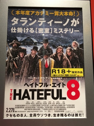 20162月29 ヘイトフル・エイト 2時間48分のタランティーノ節。長いよね。でも、最後まで一気に見せてくれます。グロいのは好みの分かれるところ。私もちょっぴり苦手。 http://gaga.ne.jp/hateful8/top/index.html 注目のアカデミー賞はマッドマックスが作品賞を逃したが、美術などで6冠だとか(^^)♪。 映画館外は出待ちの列。誰が来てたんでしょうか。