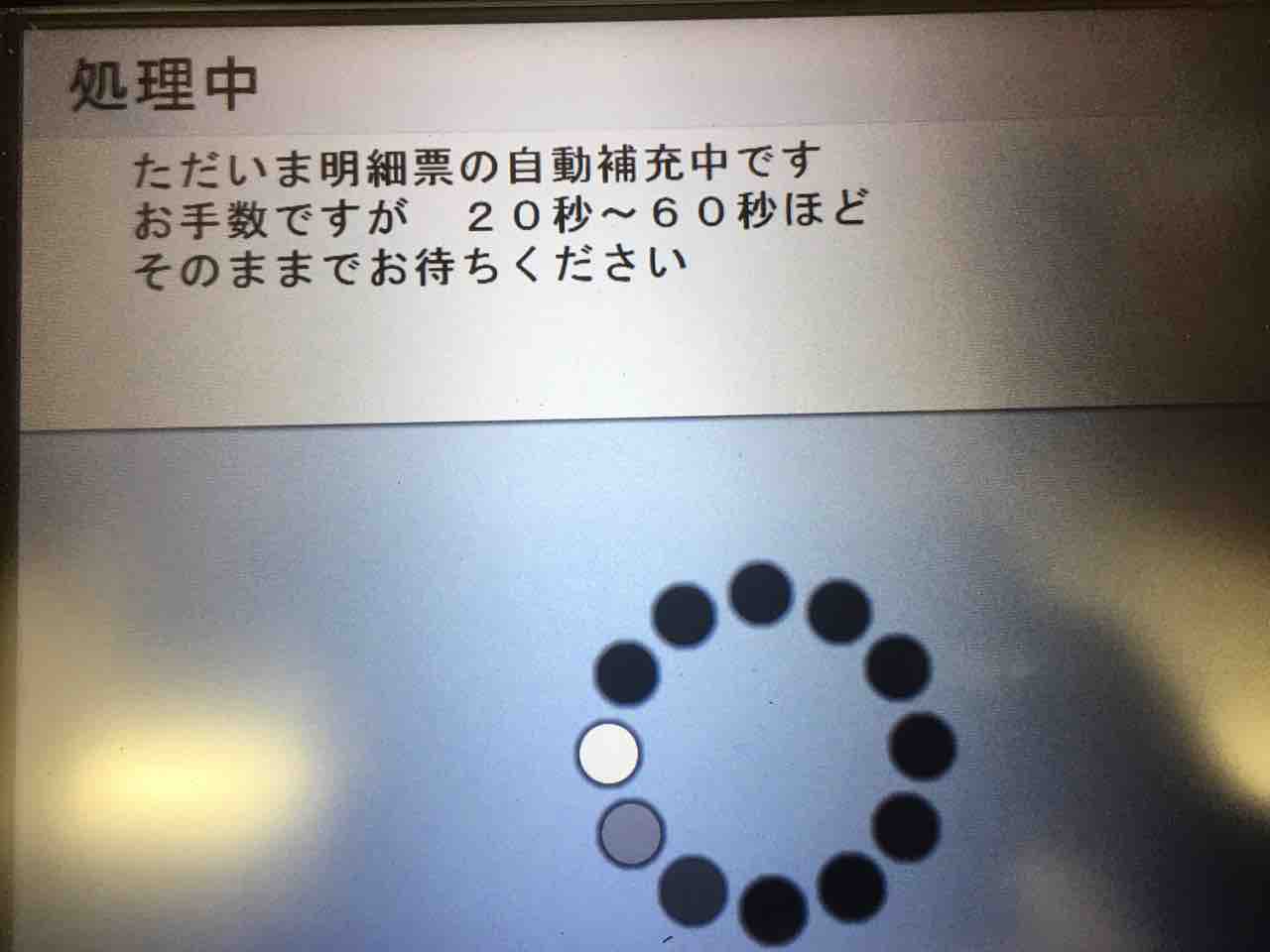 202010月30 自動補填?!^ ^ 某所。ATM明細表の自動補充を初めて目にした。四分近く待たされたあげく取引停止に^ ^;このバタバタのおかげで間違えて振り込んでしまったよ(笑)。すぐに先方へ電話連絡して返金してもらうことに(^人^)